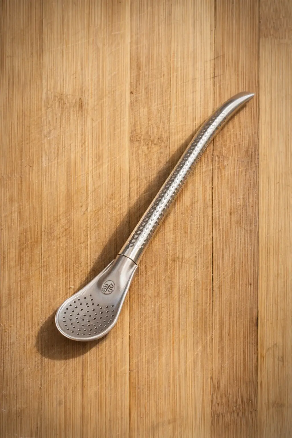 El cuerpo cincelado no solo aporta un agarre firme y seguro, sino que realza su estética, otorgándole una presencia elegante y artesanal. Con una longitud ideal de 18 cm, se adapta perfectamente a distintos tipos de mates, acompañando tanto el uso diario como momentos especiales.