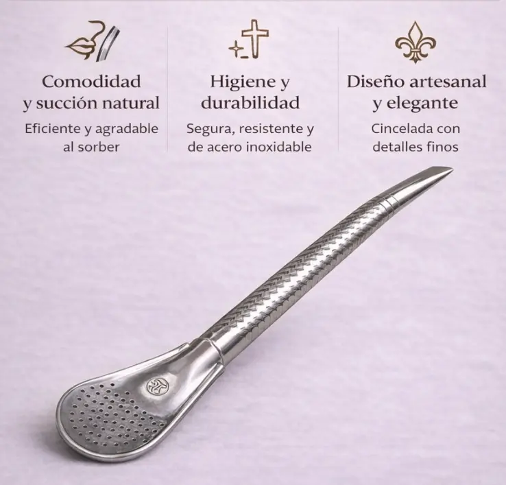 Fabricada en acero inoxidable de excelente calidad, ofrece resistencia, larga vida útil y una óptima conservación del sabor. Su pico de loro facilita una succión cómoda y natural, mientras que el filtro tipo pala con perforaciones precisas asegura un cebado parejo, evitando obstrucciones durante el uso.