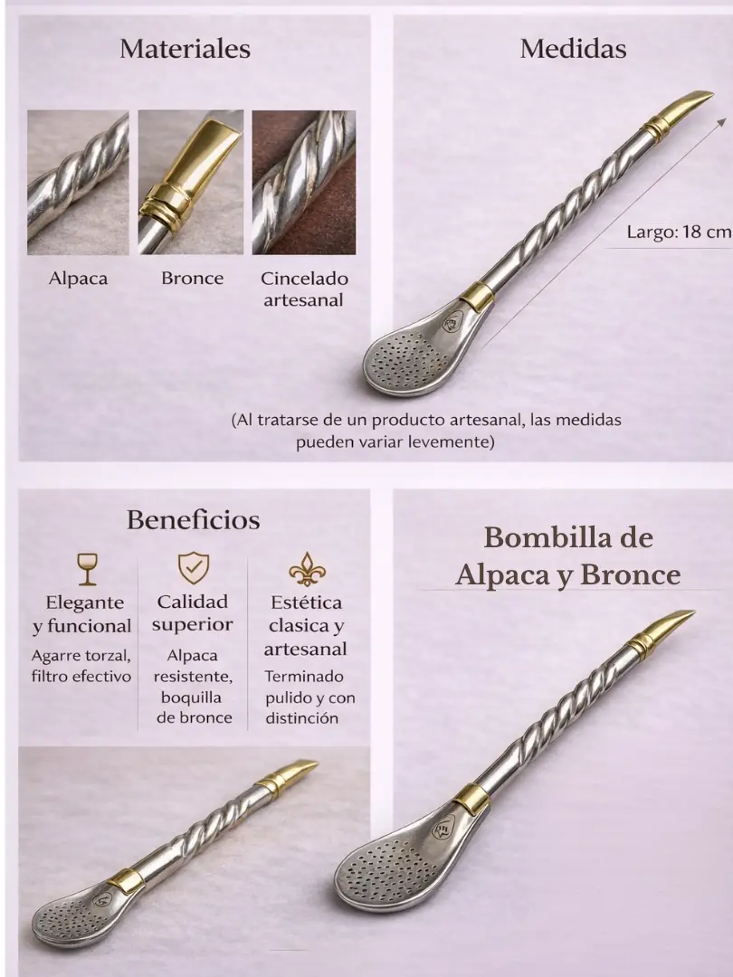 El Bombillón de Alpaca y Bronce es una pieza que combina tradición, nobleza de materiales y un diseño elegante con carácter artesanal. Pensado para quienes disfrutan del mate como un ritual consciente y valoran los detalles bien logrados, este bombillón se destaca por su presencia sólida, su estética refinada y su excelente desempeño en el uso diario.